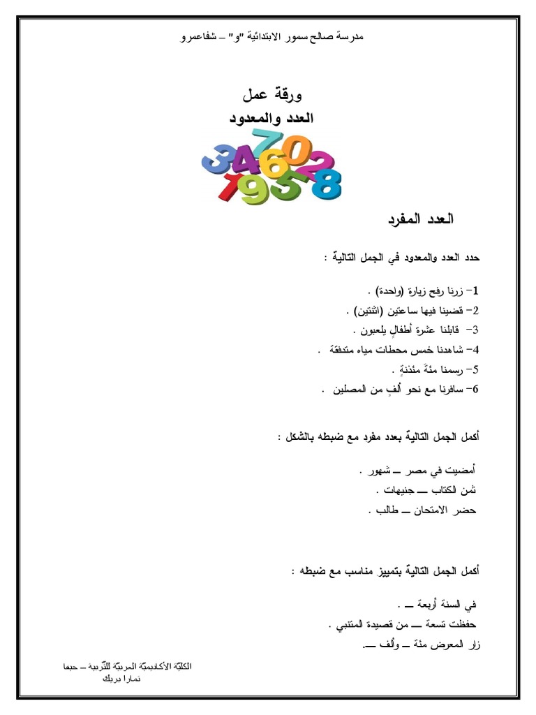 ورقة عمل عن العدد والمعدود