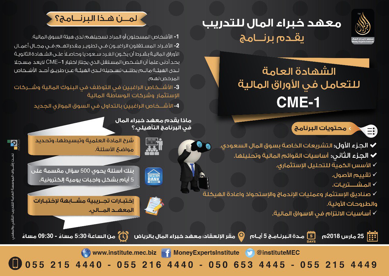 شركة خبراء المال للتدريب Money Experts Company On Twitter يطلق معهد خبراء المال للتدريب المالي الدورة التأهيلية لإختبارات الشهادة العامة للتعامل في الأوراق المالية Cme 1 لمدة 5 ايام تدريب 25 مارس بمقر