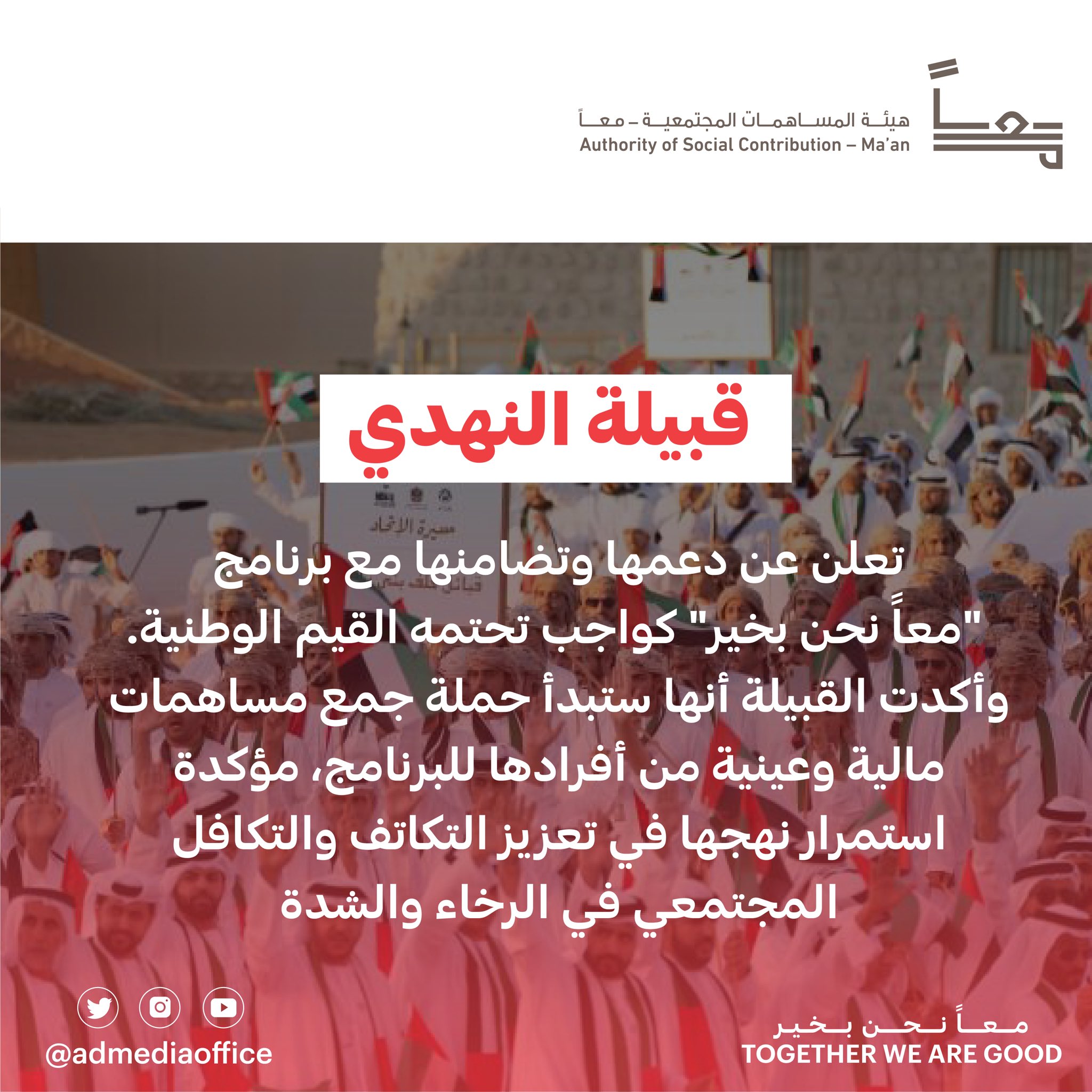 مكتب أبوظبي الإعلامي On Twitter قبيلة النهدي تعلن عن دعمها وتضامنها مع برنامج معا نحن بخير كواجب تحتمه القيم الوطنية وأكدت القبيلة أنها ستبدأ حملة جمع مساهمات مالية وعينية من أفرادها للبرنامج